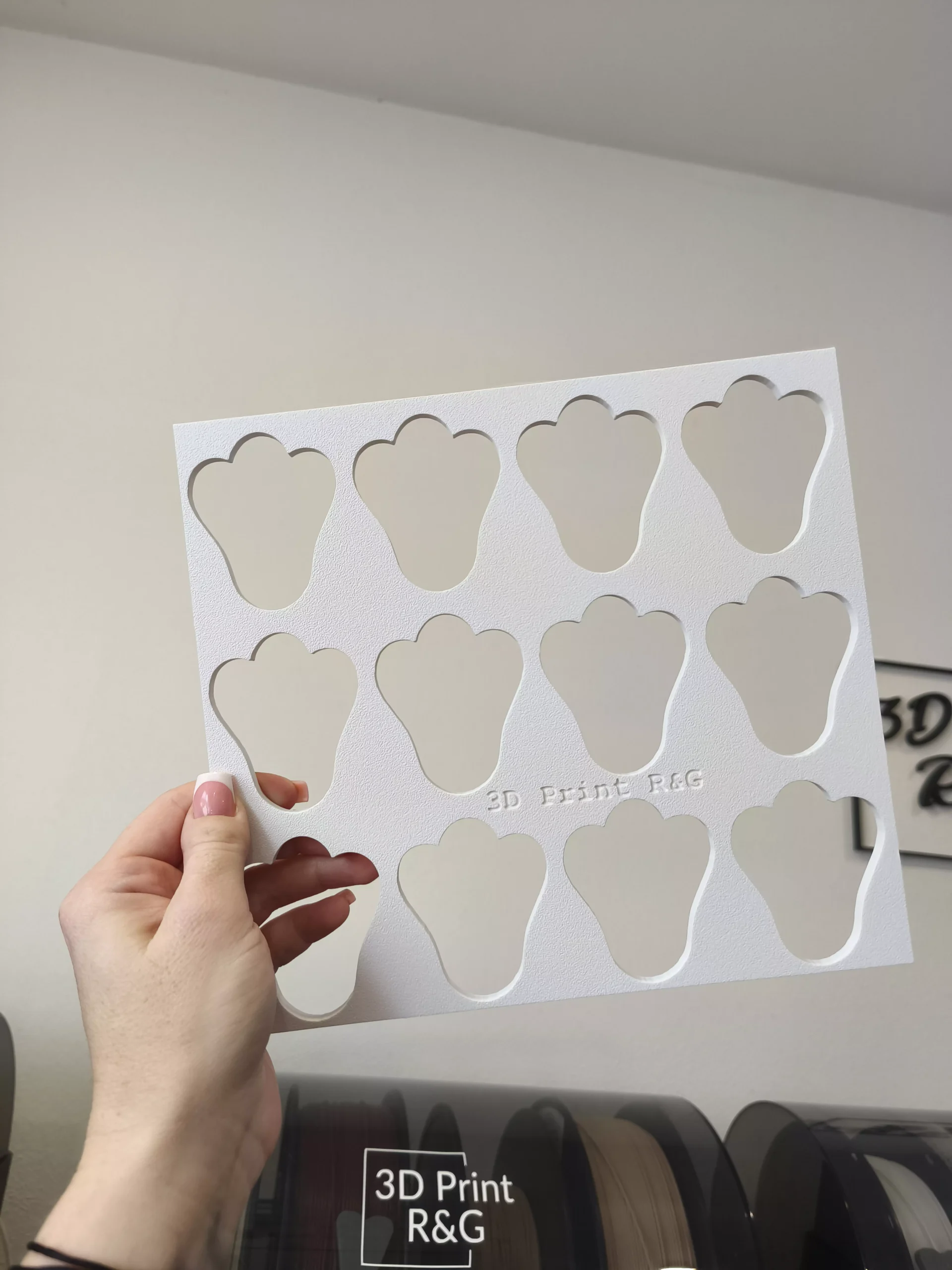 Použitie je veľmi jednoduché – šablónu položíte na plech vyložený papierom na pečenie, rozotriete stierkou po šablóne snehovú hmotu a formu opatrne zdvihnete – odklopíte z plechu. Pomocou formy vytvoríte 12 laskoniek.