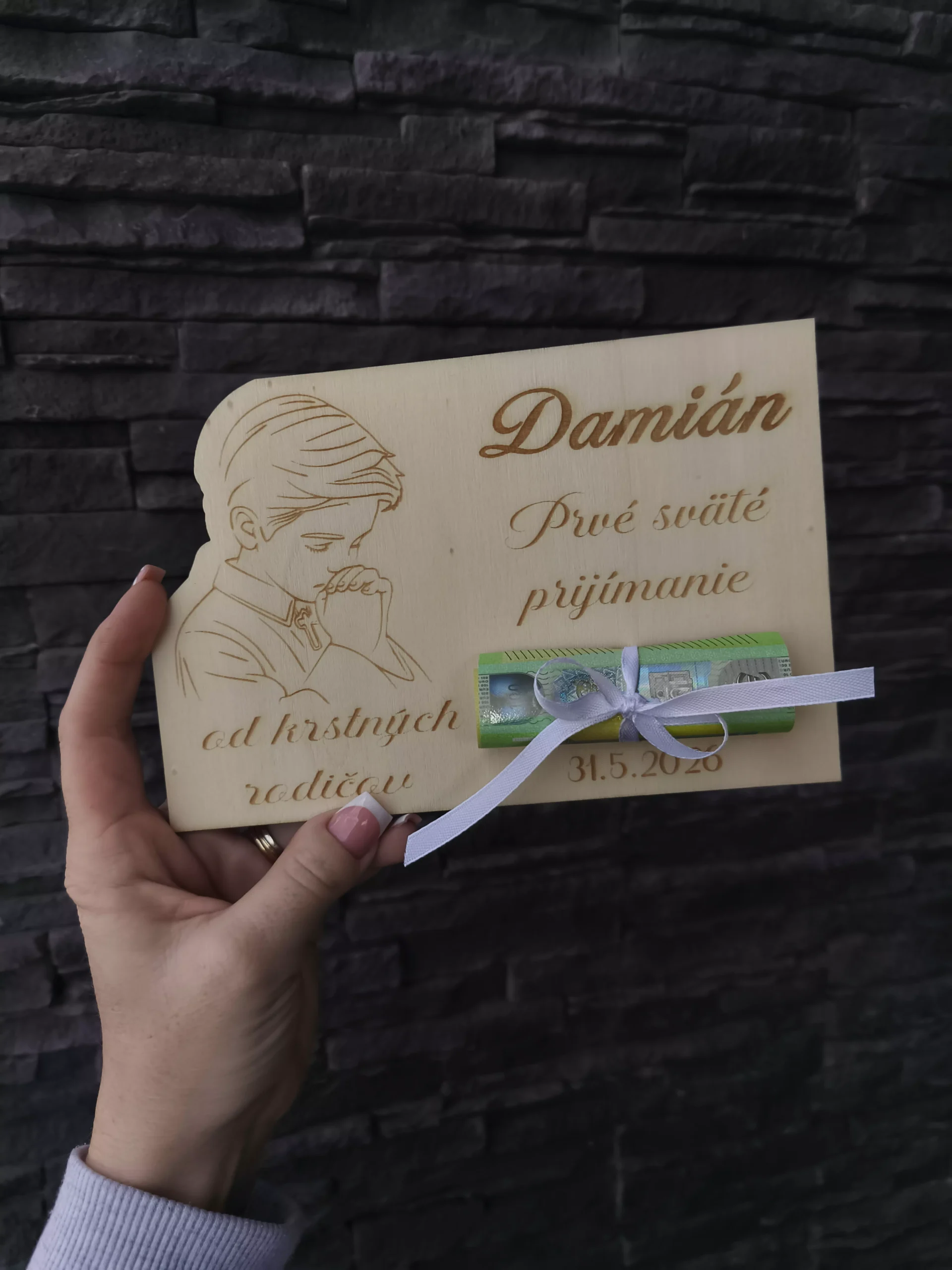 Drevená tabuľka na peniaze k prvému sv. prijímaniu, alebo ku konfirmácii – text sa dá zmeniť ku konfirmácii.. Prosím meno, dátum a venovanie od koho nám prosím napíšte do poznámky. Euro bankovky nie sú súčasťou balenia 🙂